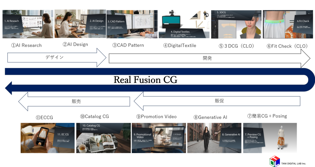 タニデジタルラボが提案するReal Fusion CGは、アパレル業界が直面する「開発期間の長期化」「サンプルコストの増大」「市場変化への対応遅れ」という3つの課題を解決する、統合型DX支援スキームです。